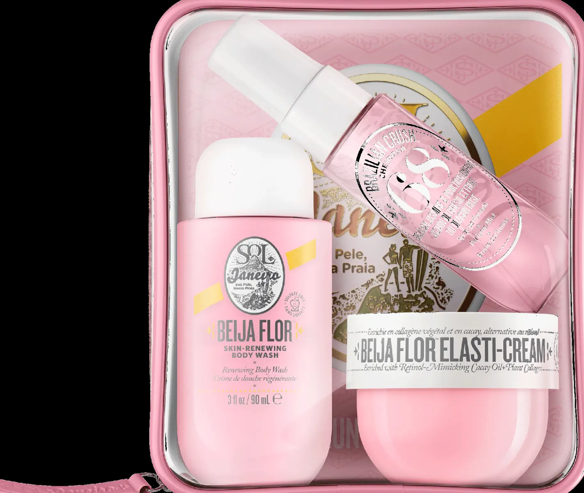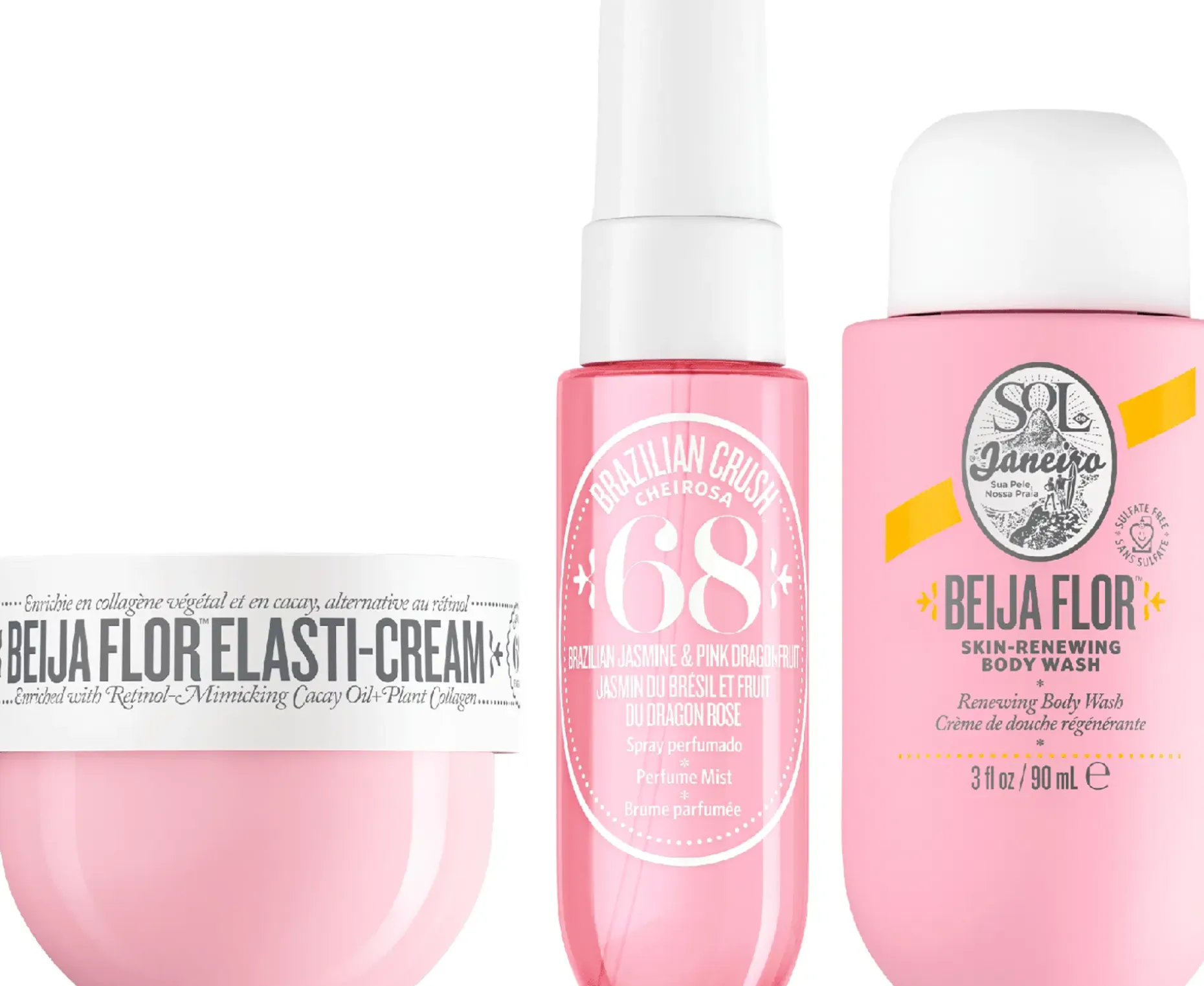Ihon elastisuutta lisäävä ja kasvikollageenia sisältävä anti age Beija Flor voide 50ml, Beija Flor suihkugeeli 90 ml ja cheirosa 68 vartalo mist 30 ml kätevässä matkapakkauksessa.