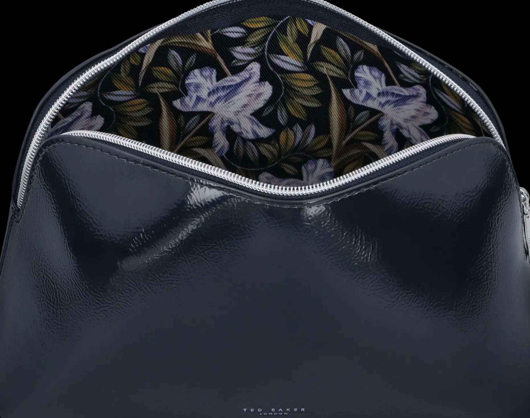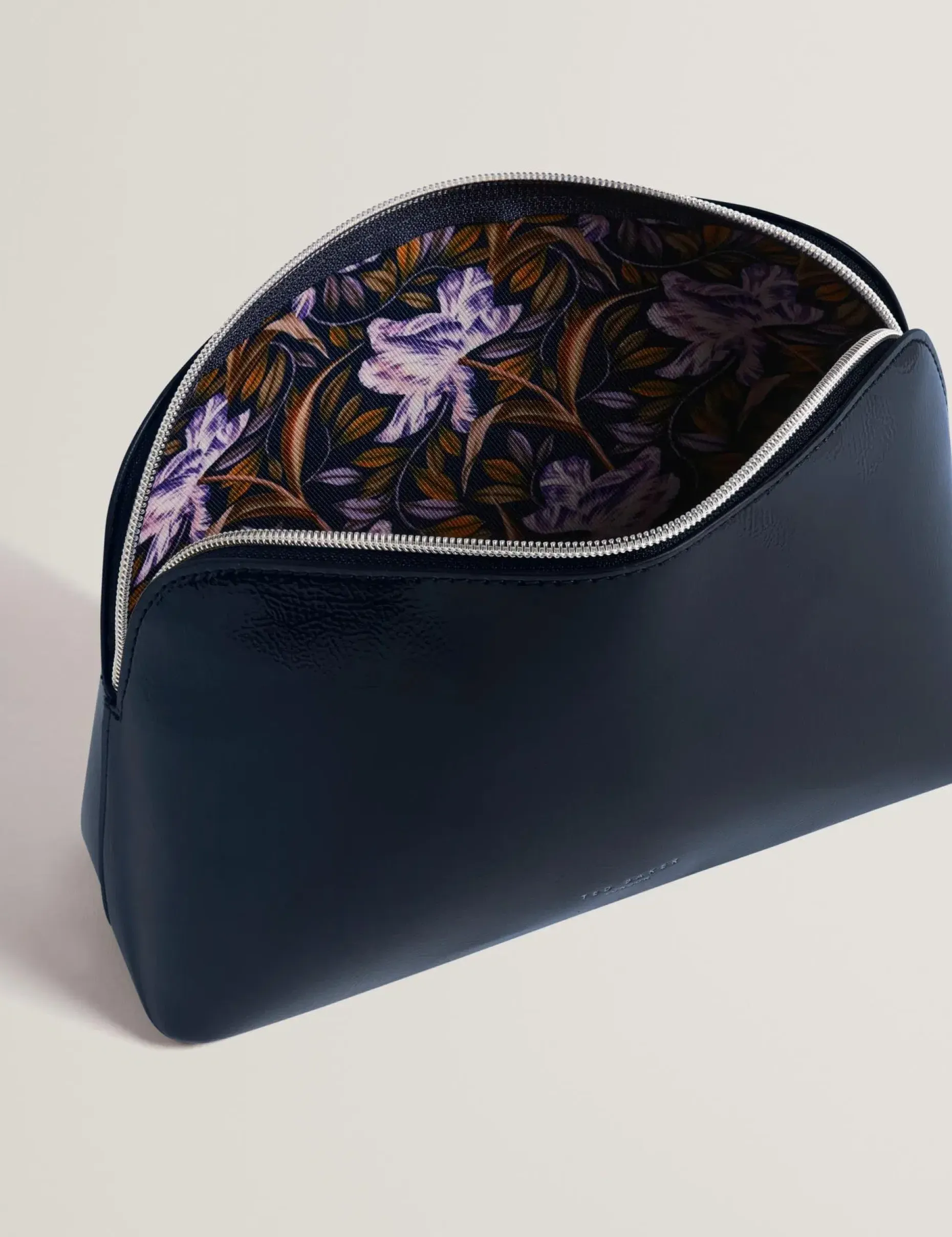 Kiitäväpintainen vetoketjullinen toilettilaukku, pieni Ted Baker logo. Sisäpinnassa kukkakuosi.