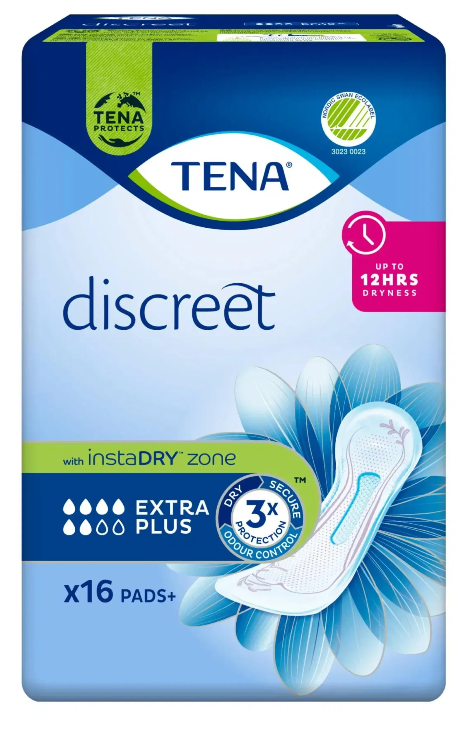 TENA Discreet Extra Plus -inkontinenssisuoja tarjoaa erittäin varmaa suojaa keskivaikeaan tai vaikeaan, odottamattomaan virtsankarkailuun. instaDRY™-ominaisuuden ansiosta neste imeytyy välittömästi, ja erittäin imukykyinen ydinosa lukitsee sen syvälle suojan sisään, pois iholta. Mukavuutta lisäävät kehoa myötäilevä muotoilu ja pehmeät sivut. TENA Discreet Extra Plus antaa kolmitehoisen suojan ohivuotoja, hajuja ja kosteaa tunnetta vastaan. Se onkin ehdottomasti paras valinta päivittäiseen keskivaikeaan tai vaikeaan virtsankarkailuun, joka saattaa yllättää aivan odottamatta. Tämän mukavasti istuvan ja salamannopeasti imevän suojan ansiosta voit tuntea olosi varmaksi jokaisessa tilanteessa.