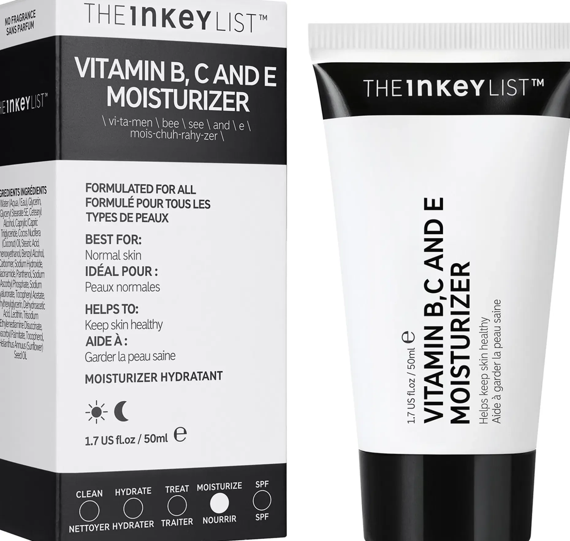 Water (Aqua/Eau), Glycerin, Glyceryl Stearate SE, Cetearyl Alcohol, Caprylic/Capric Triglyceride, Cocos Nucifera (Coconut) Oil, Stearic Acid, Phenoxyethanol, Benzyl Alcohol, Carbomer, Sodium Hydroxide, Niacinamide, Panthenol, Sodium Ascorbyl Phosphate, Sodium Hyaluronate, Tocopheryl Acetate, Ethylhexylglycerin, Dehydroacetic Acid, Lecithin, Trisodium Ethylenediamine Disuccinate, Ascorbyl Palmitate, Tocopherol, Helianthus Annuus (Sunflower) Seed Oil.