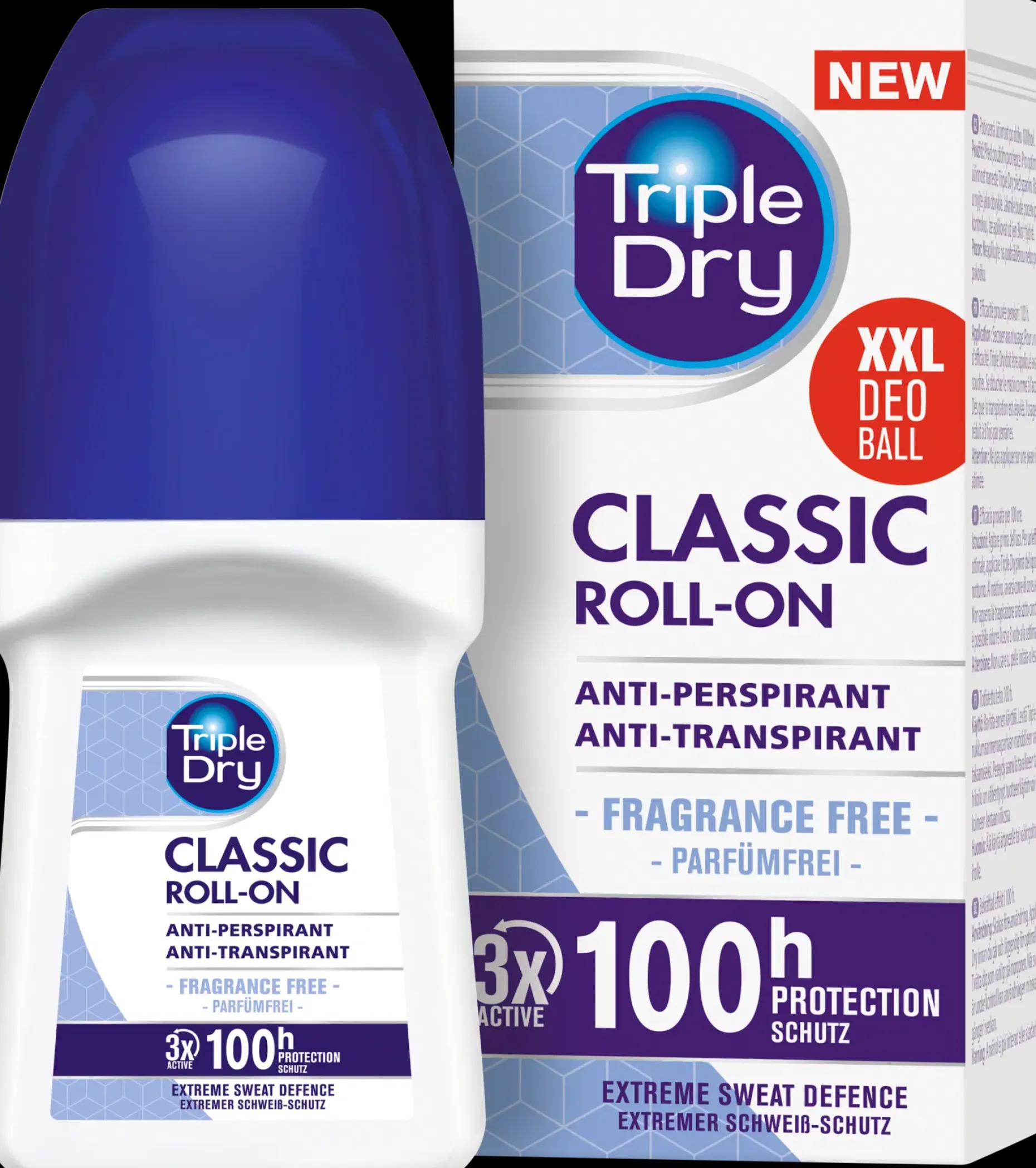 Triple Dry Classic 100h antibakteerinen antiperspirantti roll-on estää tehokkaasti liiallista hikoilua. Sen kliinisesti todistettu kolmivaiheinen suojauskompleksi ja aktiivinen koostumus tarjoavat maksimaalisen tehon ja pitkäkestoisen vaikutuksen jopa 100 tunnin suojan hikoilua ja hajuja vastaan, mukautuen kehon tarpeisiin ja lämpötilaan. Hoitavana aineena tuotteessa kosteuttavaa glyseriiniä ja ihoa rauhoittavaa allantoiinia. Käytännöllinen, suuri rollonpallon muotoilu nopeaan ja mukavaan levitykseen. Sopii normaaliin tai voimakkaaseen hikoiluun kaikille, jotka tarvitsevat pitkäkestoista suojaa hikoilua vastaan. Sopii myös herkkäihoisille ja hajusteallergisille. Hajusteeton. Ei sisällä alkoholia.