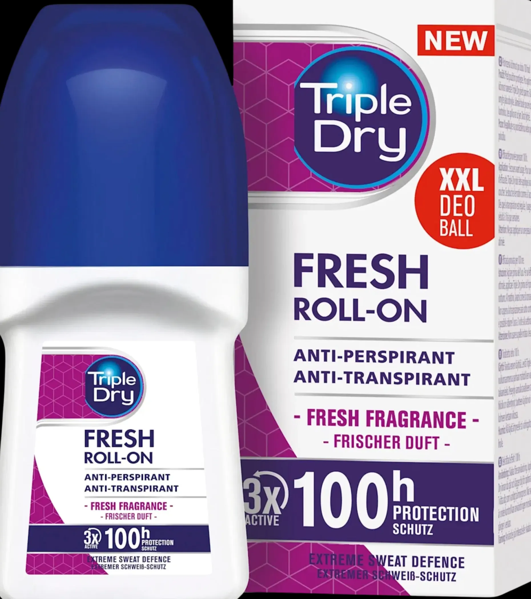 Triple Dry FRESH ROLLON 100H -antiperspirantti taistelee tehokkaasti liiallista hikoilua vastaan. Sen kliinisesti todistettu kolminkertainen aktiivinen koostumus tarjoaa jopa 100 tunnin suojan hikeä ja hajuja vastaan. Aantibakteerinen ja alkoholiton. Raikas tuoksu. Käytännöllinen – suurikokoinen rollonpallo nopeaan ja mukavaan käyttöön. Sopii normaaliin tai voimakkaaseen hikoiluun kaikille, jotka tarvitsevat pitkäkestoista suojaa hikoilua vastaan. Hellävarainen koostumus sisältää hoitavia ainesosia, kuten glyseriiniä ja allantoiinia, jotka vähentävät ihoärsytystä. NO SWEAT 100h. Lue pakkauksen käyttöohje huolellisesti ennen käyttöä.