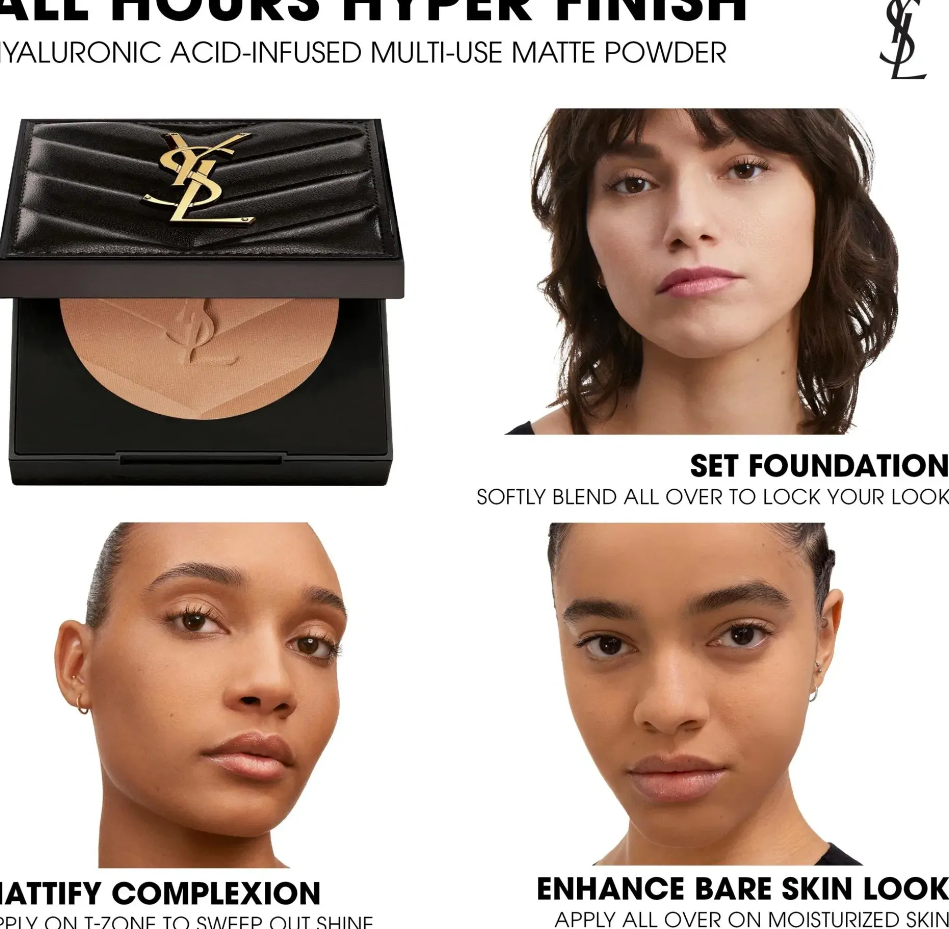 All Hours Hyper Finish Powder on uusi monikäyttöinen couture-mattapuuteri, joka antaa mattapinnan ja kiinnittää meikkivoiteen jopa 24 tunniksi*. Voit käyttää sitä myös paljalle iholle korostamaan ihoa ja antamaan luonnollisen lopputuloksen. Meikki on kiinnitetty, meikkivoiteen sävy ei muunnu eikä lopputulos koskaan tunnu paakkuuntuvalta tai kuivalta. Hyaluronihappoa sisältävä koostumus sisältää ihoa hoitavia aktiivisia ainesosia joista on 90 % luonnollisia ainesosia. Se saa ihon tuntumaan miellyttävältä ja sileältä. Hyper Finish on puuteri, johon voit luottaa koko päivän, koko yön. All Hours Hyper Finish Powder sisältää puuterivipan.