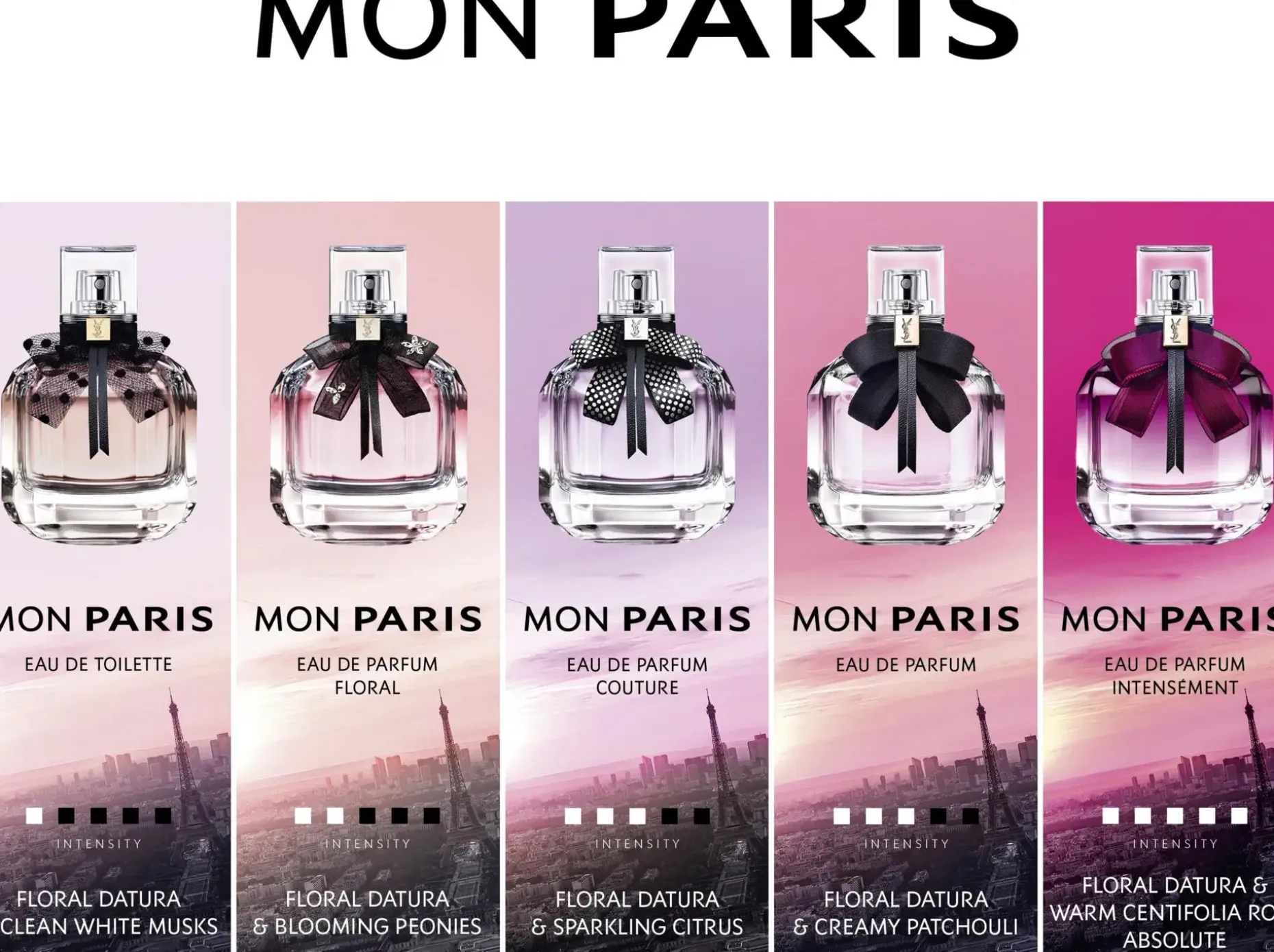 Yves Saint Laurent Mon Paris Eau de Parfum. Pariisin, rakkauden kaupungin inspiroima täyteläinen tuoksu. Punaiset marjat ja päärynä huokuvat aistikkuutta ja naisellisuutta. Eksoottinen valkoinen datura on tämän tuoksun sielu, joka ilmaisee sekä halua että viettelee aisteja. Modernin täyteläinen kukkaistuoksu on tasapainotettu valkoisella myskillä ja patsulilla.