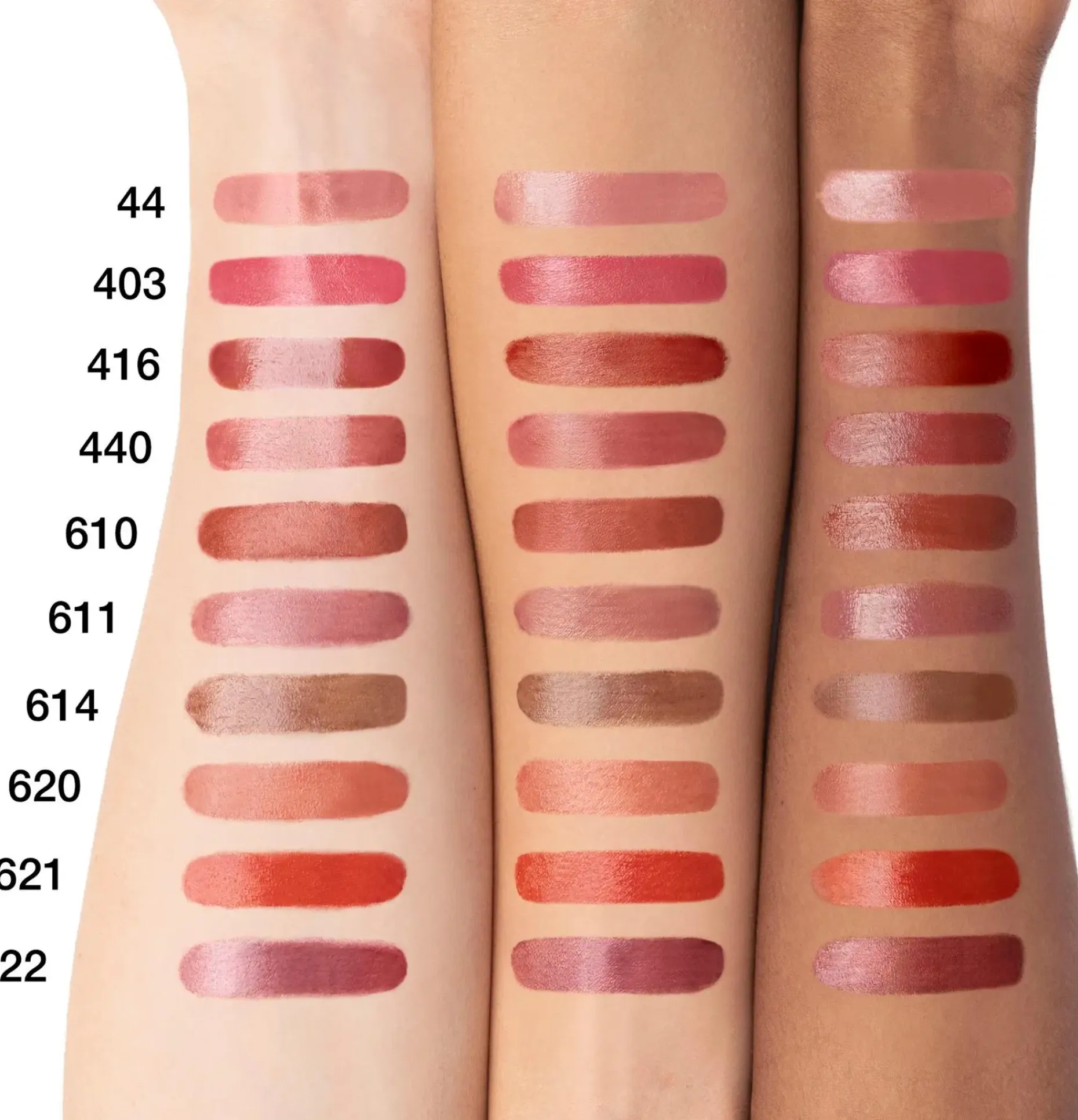 LEVITTÄMISVINKKEJÄ Määrittele huulten ääriviivat applikaattorin pyöristetyillä reunoilla pehmeän ja tarkan lopputuloksen saamiseksi. Levitä kerros huulten keskelle applikaattorin terävällä kärjellä optimaalisen väritarkkuuden saavuttamiseksi. Harjaa kohti ulkoreunoja kevyellä, liukuvalla liikkeellä.