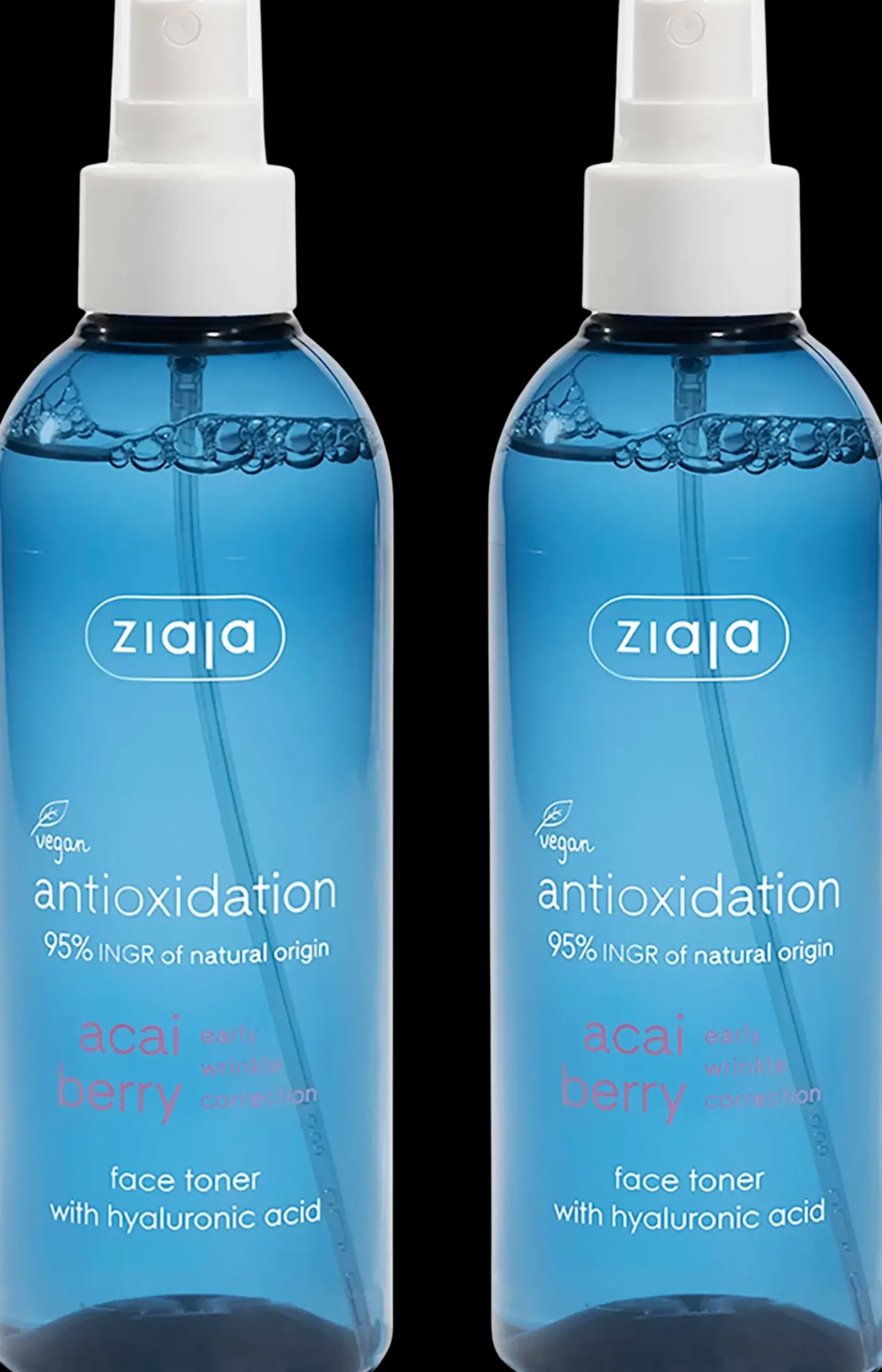 Pakkaus sisältää kaksi 200 ml virkistävää ja kosteuttavaa Ziaja Acai Berry kasvovesisuihketta väsyneelle, elottomalle ja herkälle iholle.